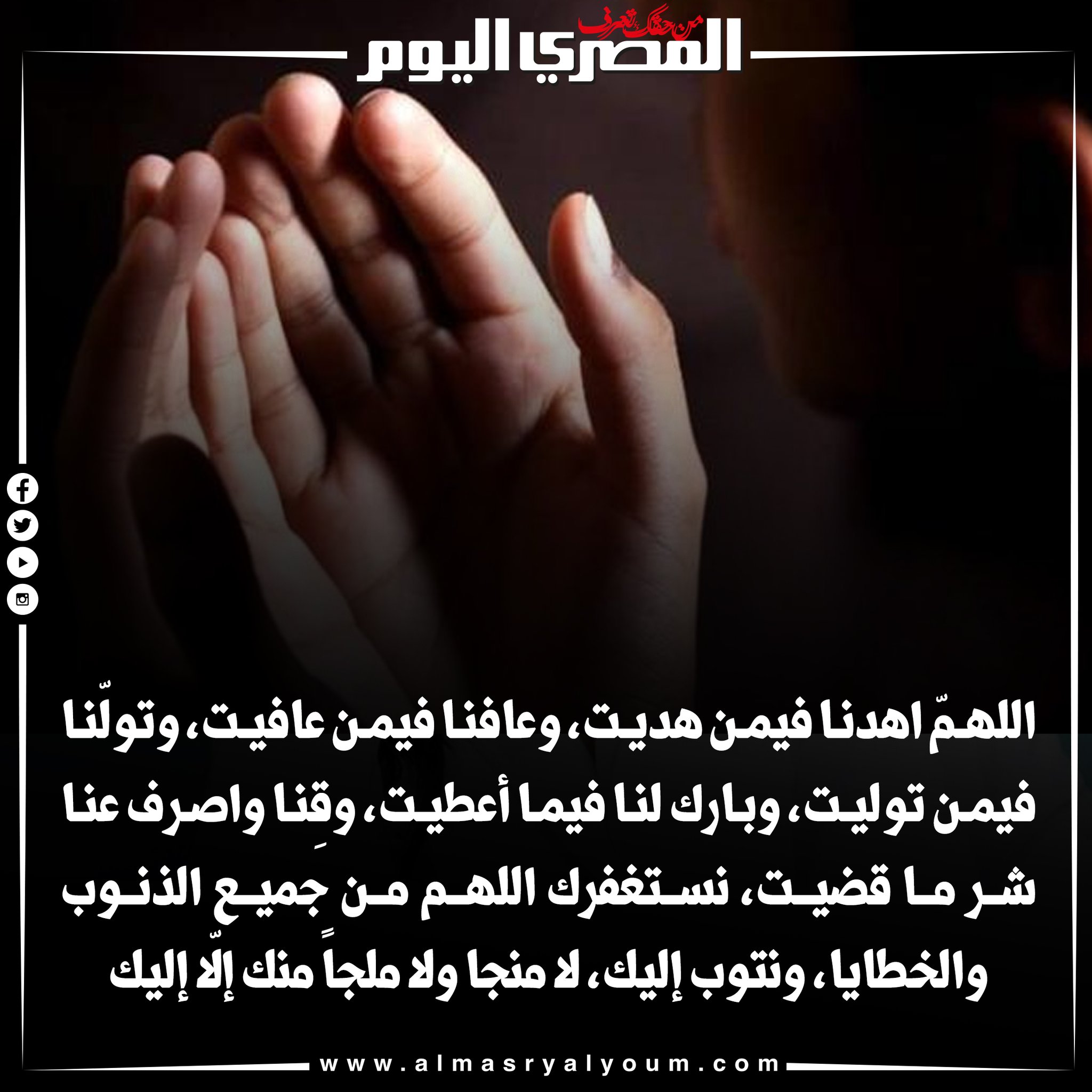 اللهمّ اهدنا فيمن هديت، وعافنا فيمن عافيت، وتولّنا فيمن توليت، وبارك لنا فيما أعطيت، وقِنا واصرف عنا شر ما قضيت، نستغفرك اللهم من جميع الذنوب والخطايا، ونتوب إليك، لا منجا ولا ملجاً منك إلّا إليك